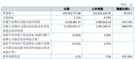 挖贝网 4月16日消息,福兴粮油(838931)近日公布的2019年年度报告显示,2019年营业收入为105,923,771.88元,较上年同期下滑29.55%;归属于挂牌公司股东的净利润为-9,338,082.15元,较上年同期由盈转亏;基本每股收益为-0.20元,上年同期为0.06元。